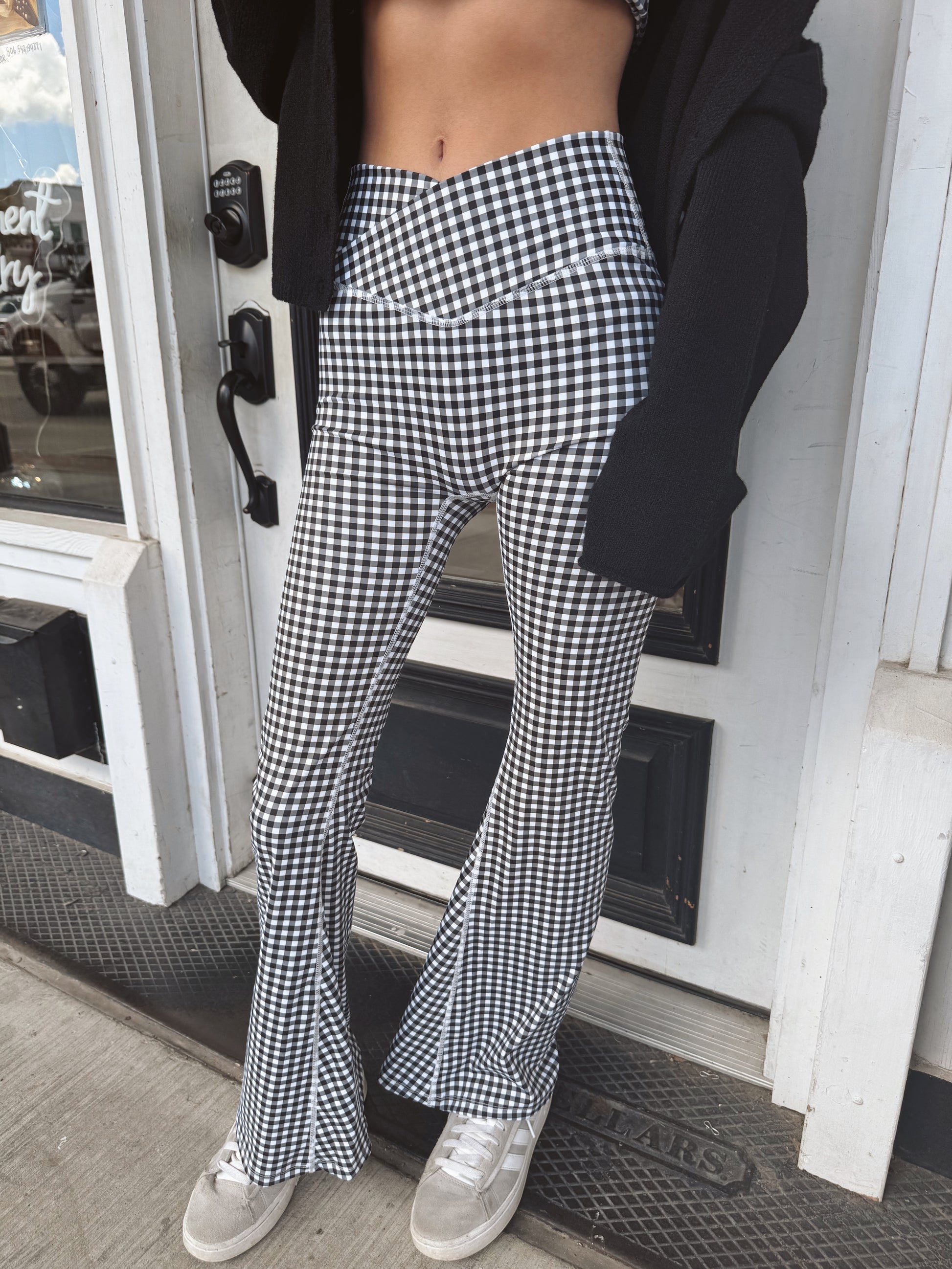 Step into playful comfort with the Alice Gingham Print High Waist Crossover Flare Legging. These butter-soft leggings hug your curves with a seamless, second-skin feel, while the high waist and crossover design add a flattering touch. The fun gingham print and flared silhouette bring a fresh twist to your everyday look. Perfect for twirling through your day in style!