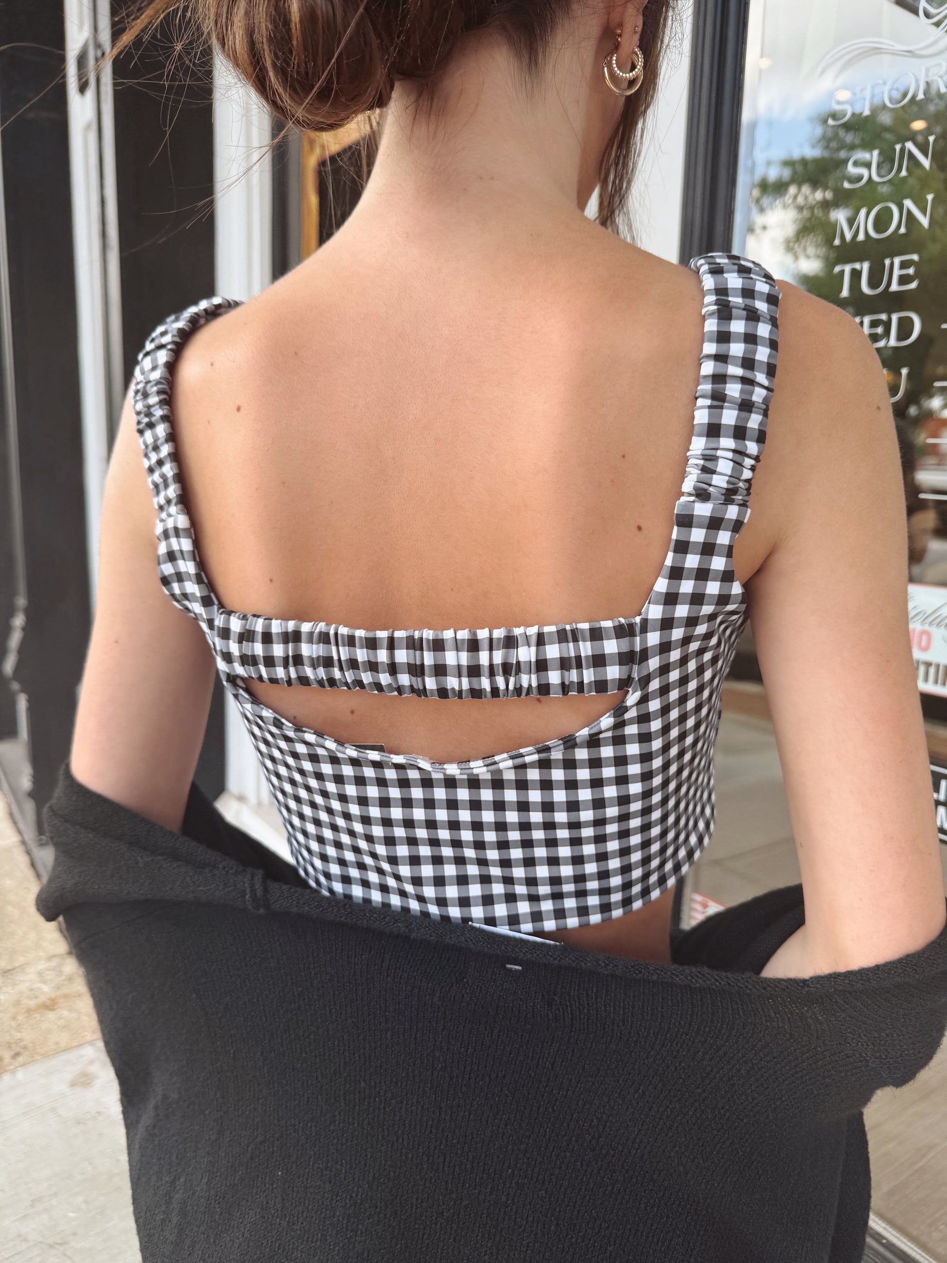 This playful Alice Gingham Print Ruched Bra Top features a charming gingham pattern and scrunch straps that you can adjust for the perfect fit. With removable padding and an open-back detail, it combines comfort and flirty style effortlessly. Perfect for adding a fun, fresh touch to your summer wardrobe!