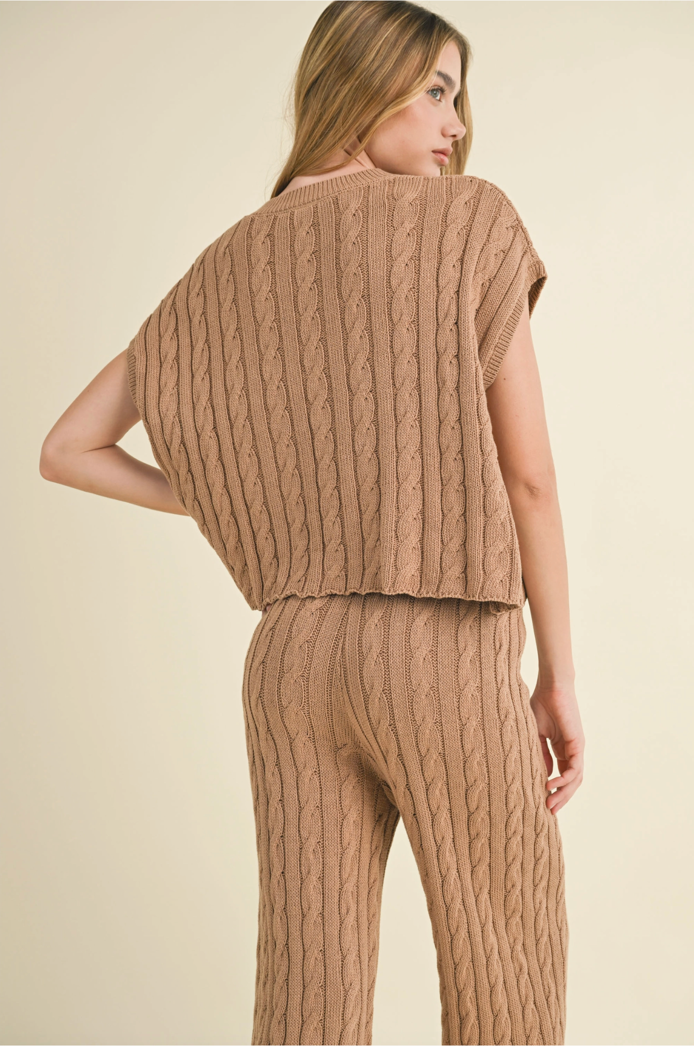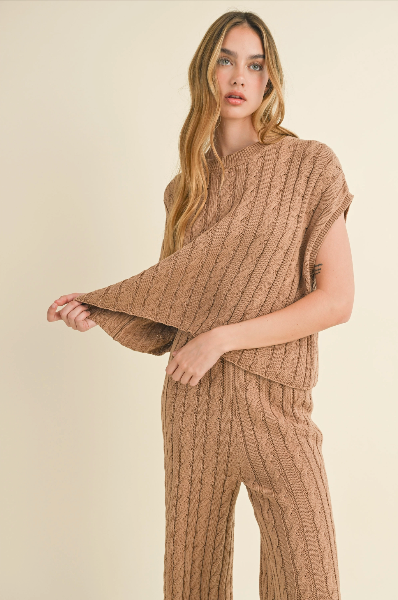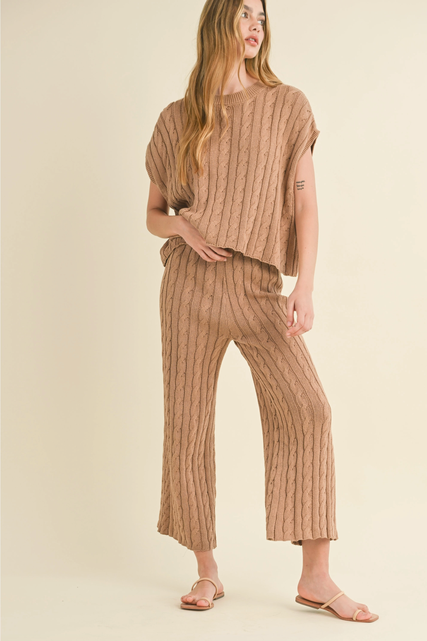 Slip into cozy charm with the Brinn Cable Knit Pants in warm tan. Their soft, textured knit hugs you in comfort while adding playful dimension to your look. Perfect for lounging or layering, these pants bring a snug, stylish vibe to your relaxed days. Whether paired with a simple tee or a chunky sweater, they keep you comfy and effortlessly chic.