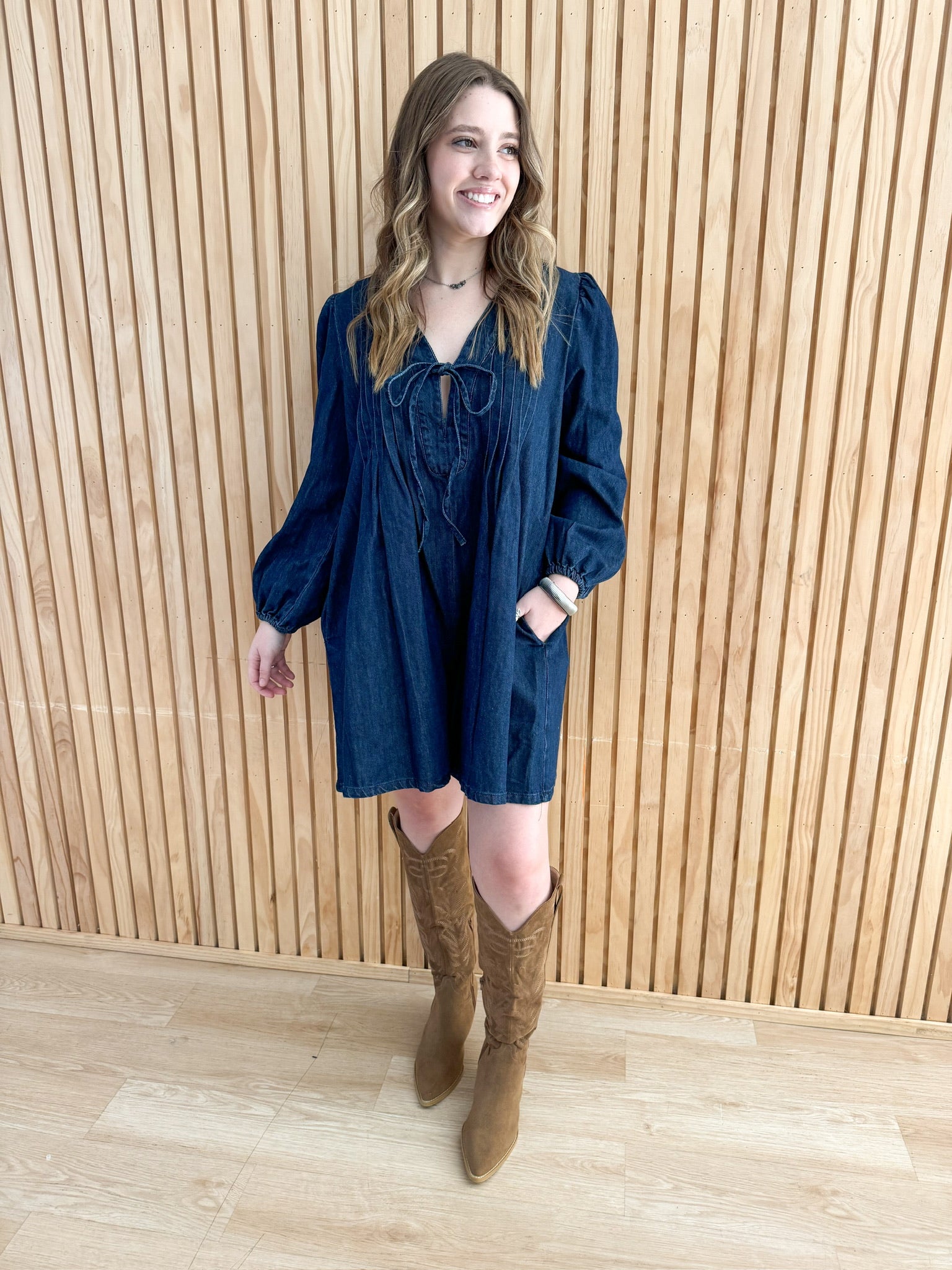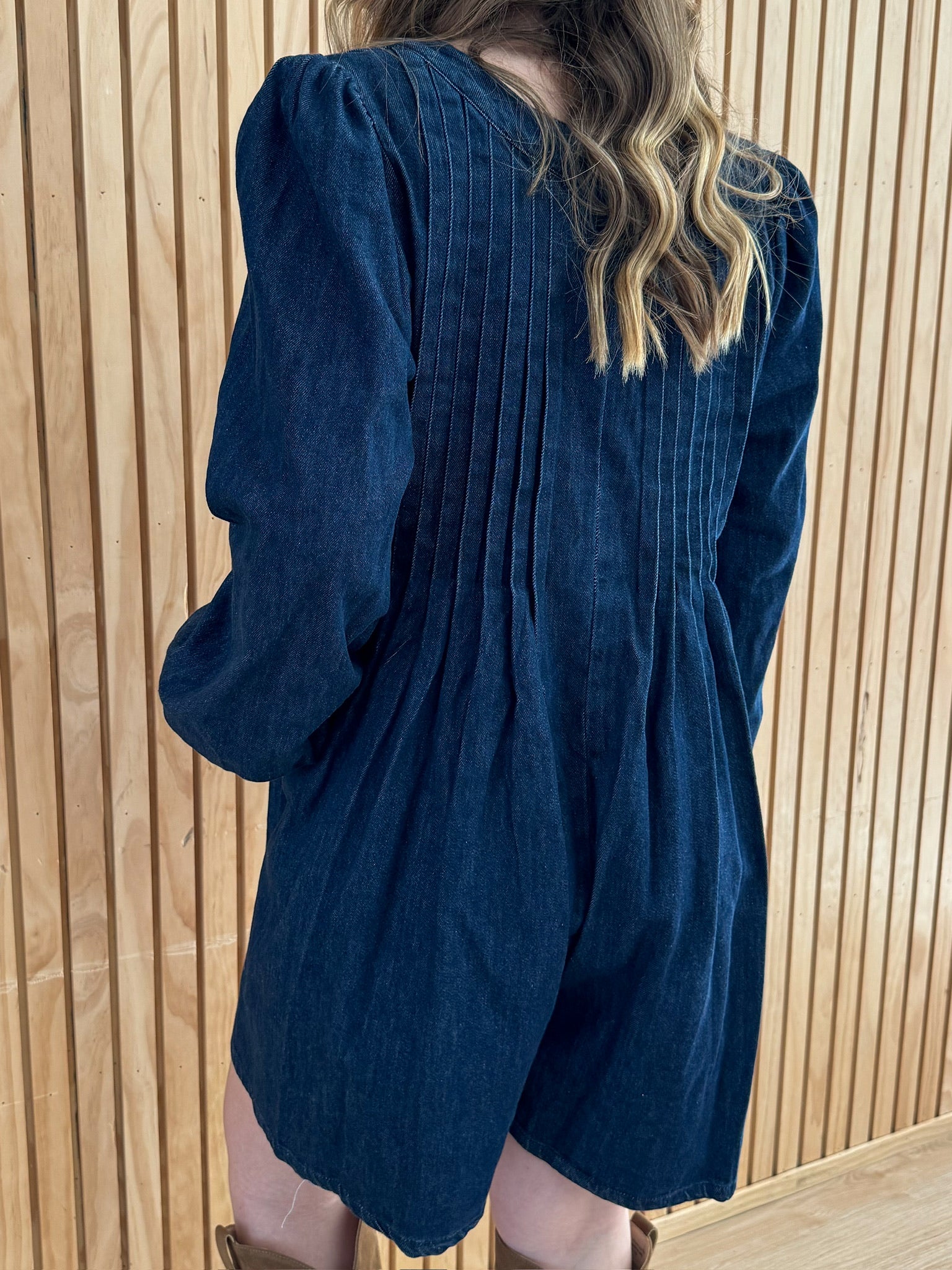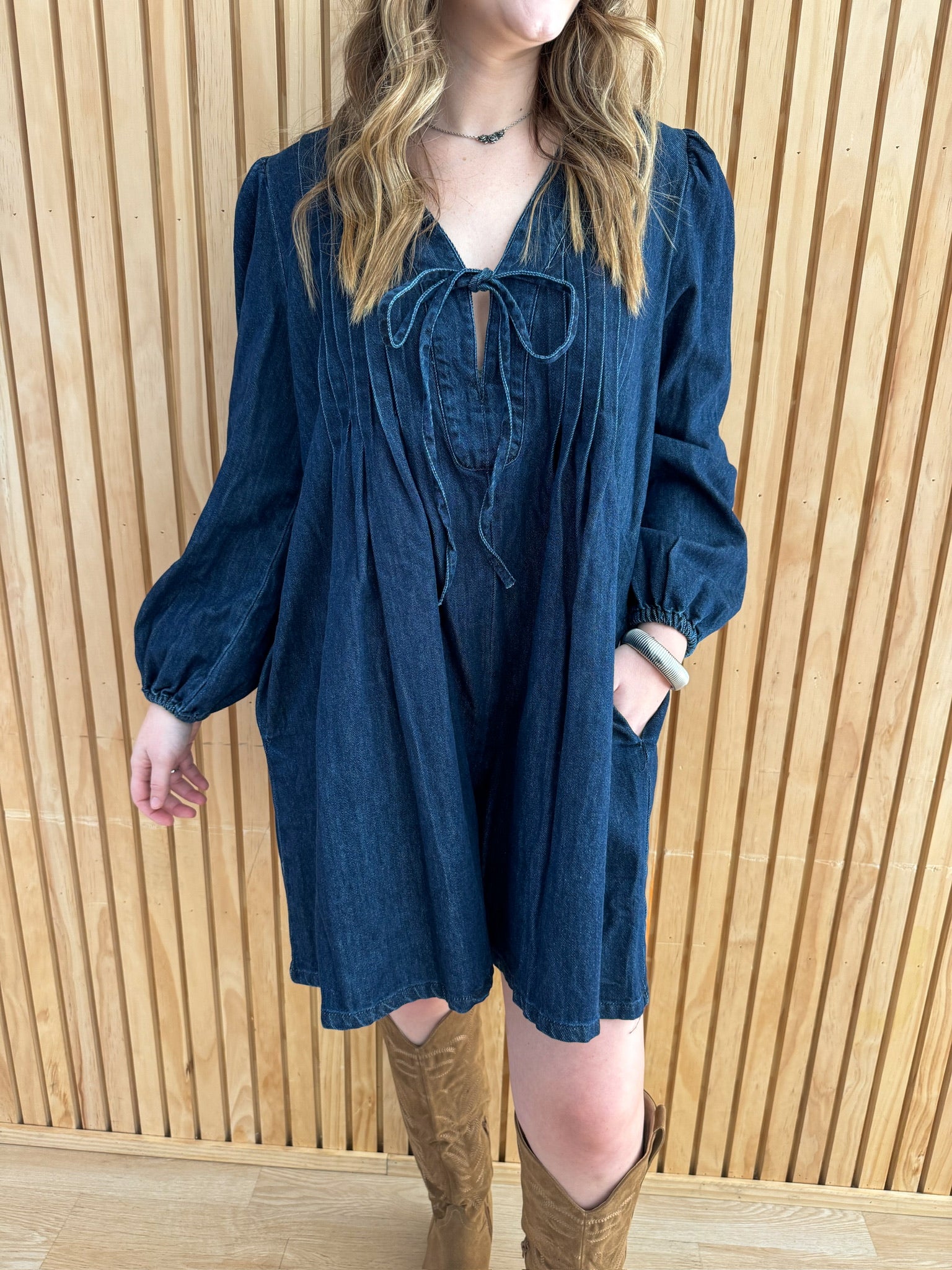A romper that works overtime, this denim one-piece brings together style and function with its pleated front, tie waist, and convenient pockets. Perfect for a casual day out or a fun night in, the Brit Pleated Denim Romper is a versatile addition to any wardrobe.