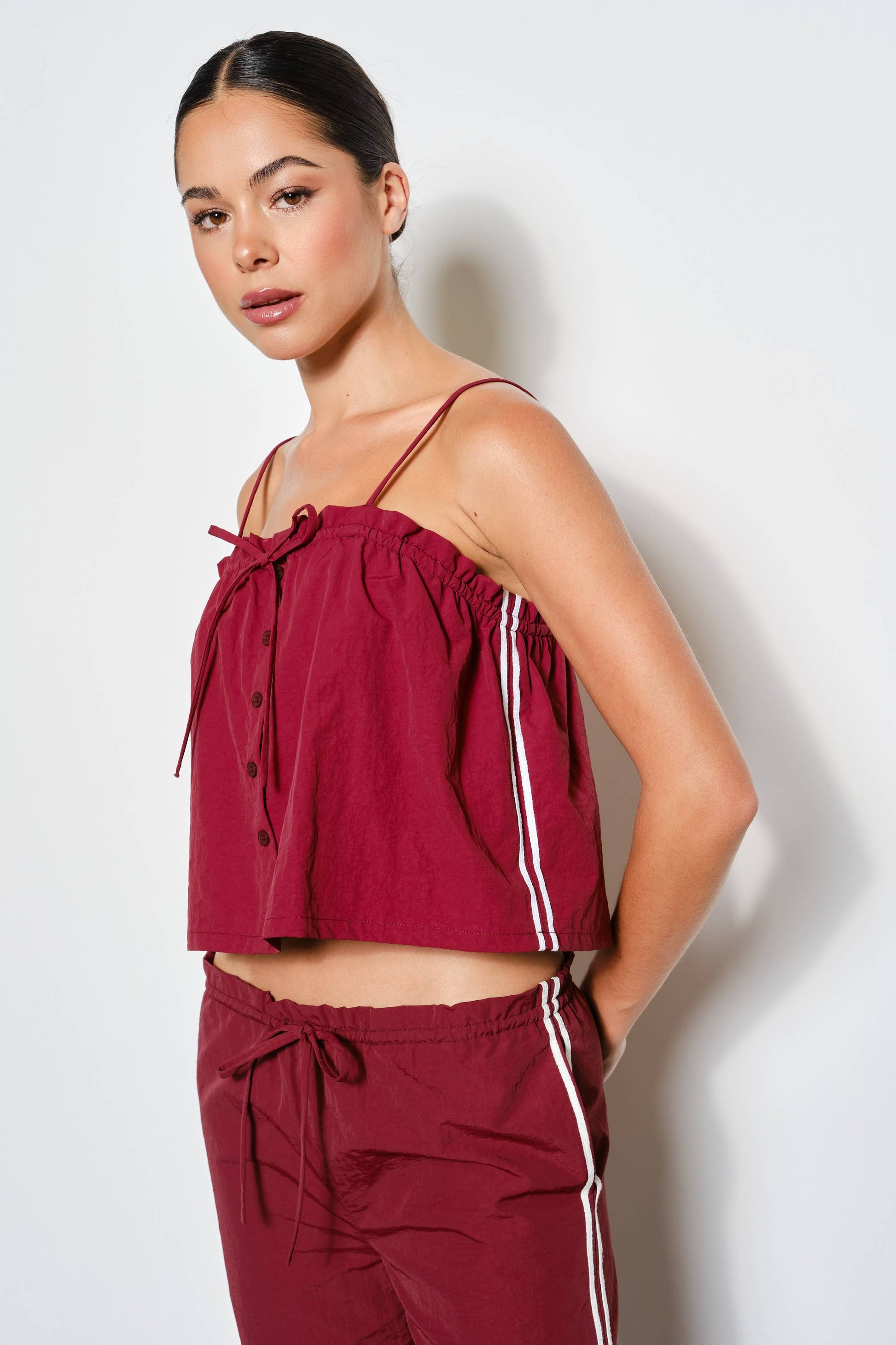 Sporty meets sweet in the Claudia Track Cami! This lightweight nylon top features playful ruffle details and a flirty self-tie ribbon that adds a feminine touch to its athletic vibe. Adjustable spaghetti straps provide the perfect fit, while the front button closure keeps the look polished and easy. Finished with bold stripe accents at the sides, this cami brings a modern, street-chic edge to your wardrobe. Pair with our Claudia Track Pants to complete the set!