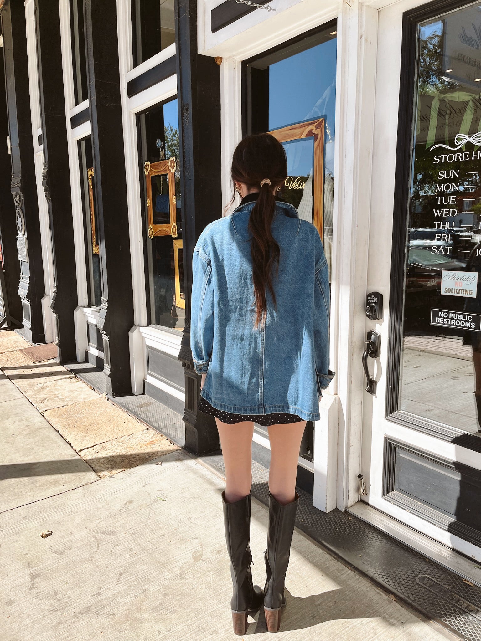 Meet your new favorite layer: the Dani Denim Chore Jacket! Crafted from sturdy denim and topped with a cozy black corduroy collar, this jacket brings classic workwear vibes with a fun twist. Perfect for adding a bit of edge to any outfit while keeping you comfy and cool. Whether you're out exploring or just hanging around, Dani’s got your back—and your style!