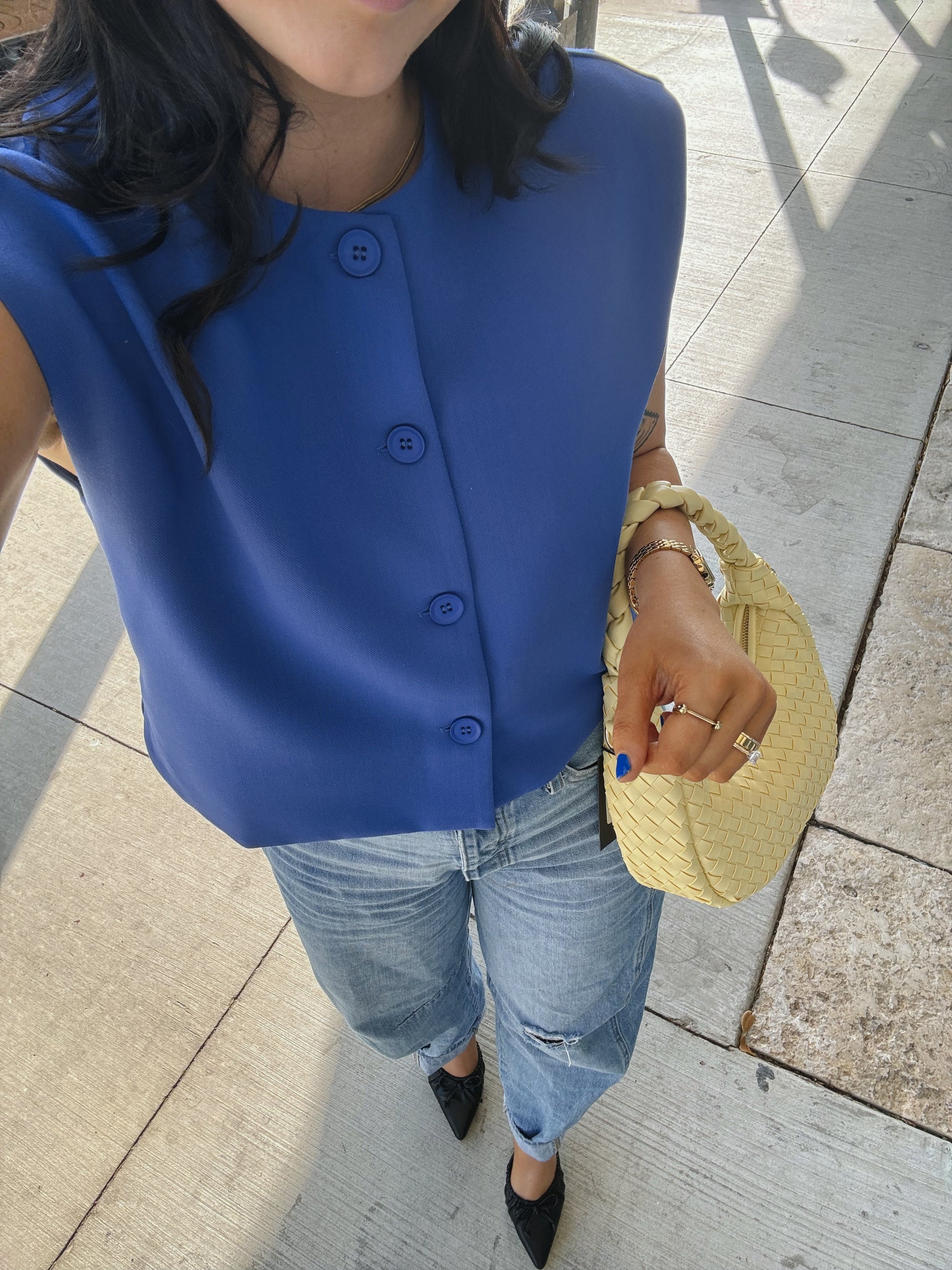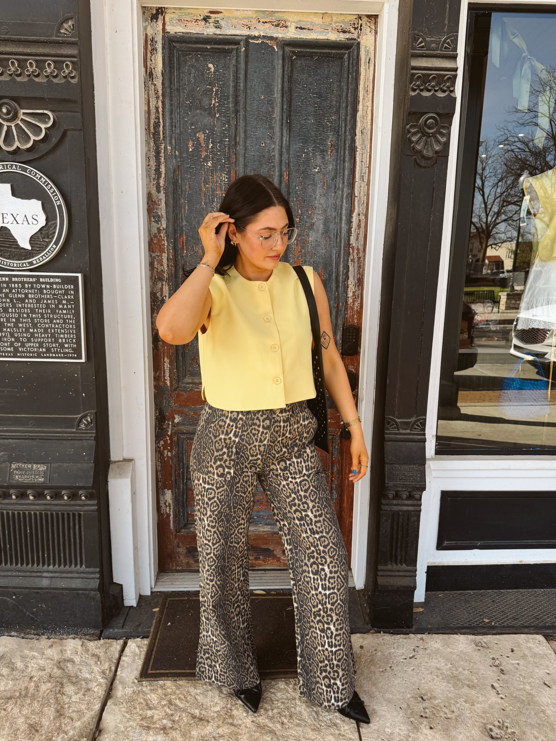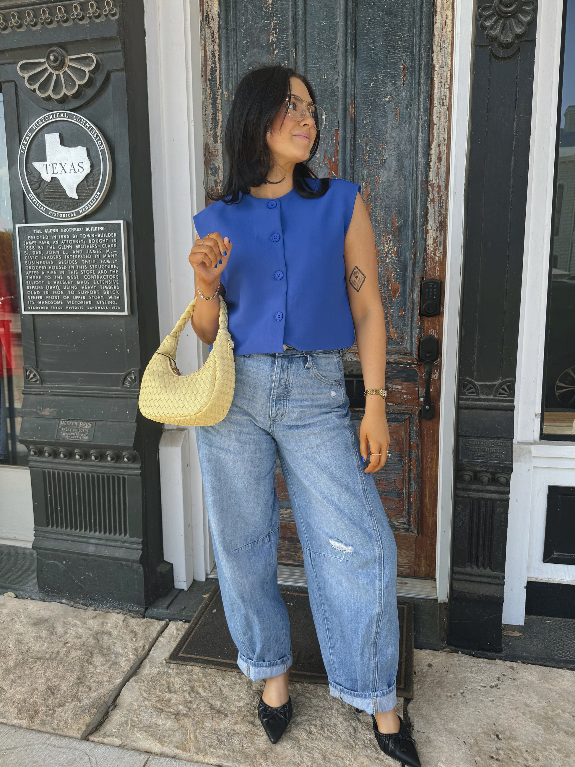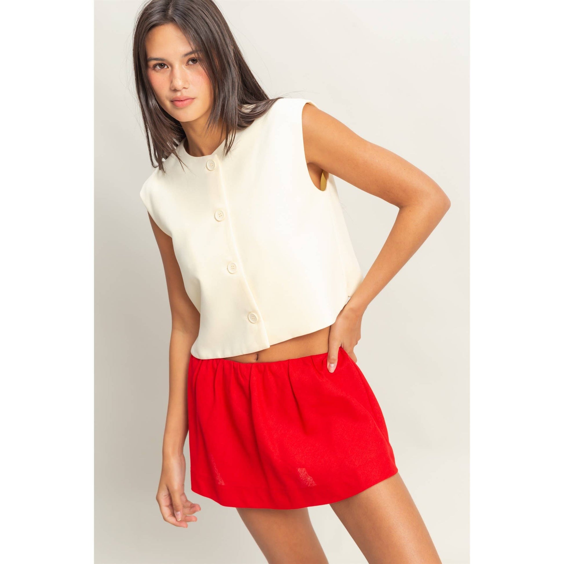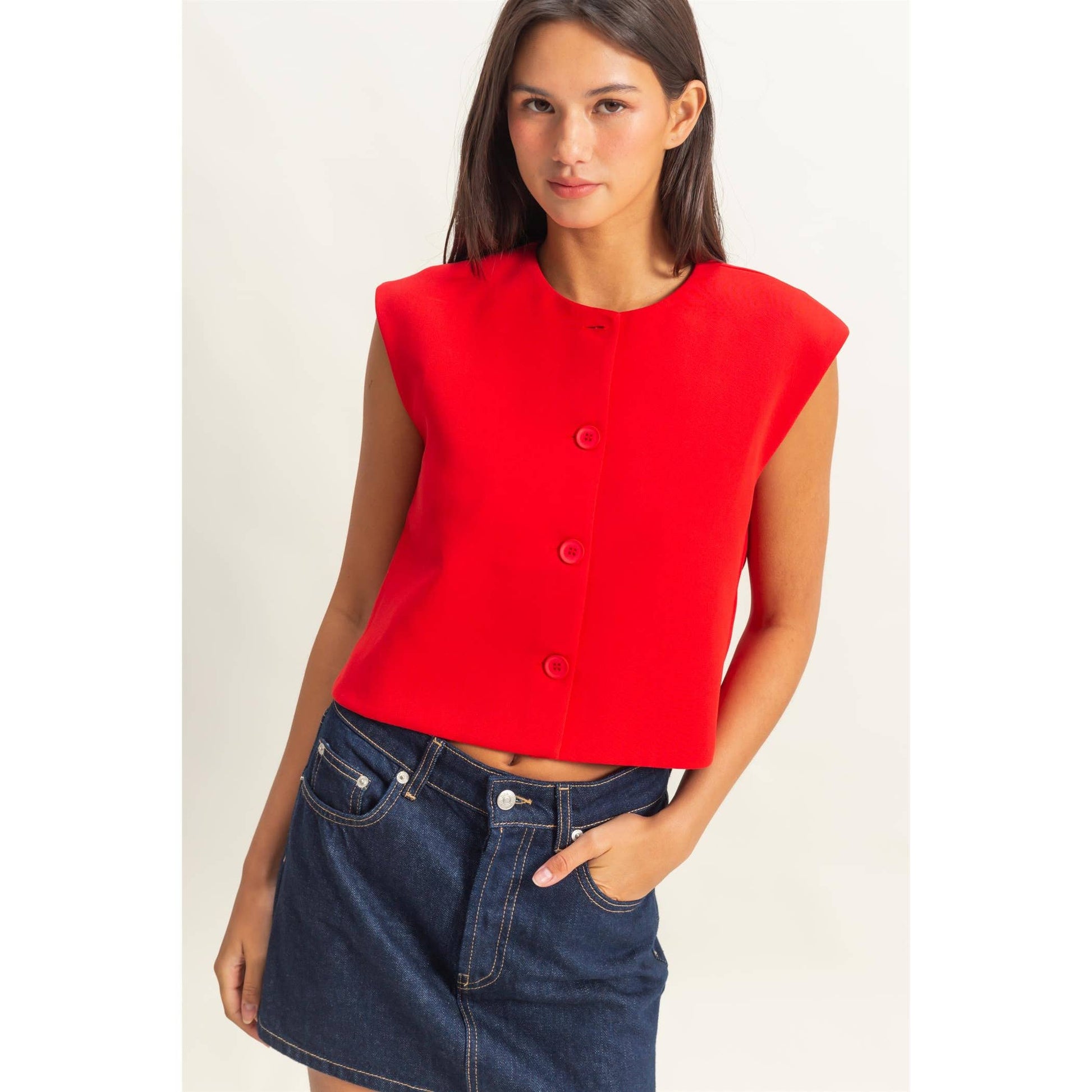 Rock a chic look in our Daisy Knit Vest Top. Crafted from woven fabric, this top features a crew neckline, sleeveless cut, and button-front detailing. Its cropped hem pairs perfectly with high-waisted pants for a stylish ensemble. (Cropped for a fun and flirty vibe!)