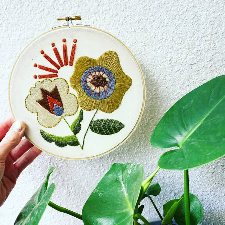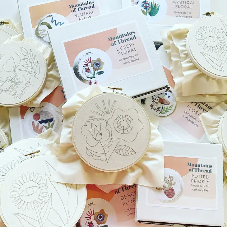 Kits include a wooden embroidery hoop with fabric and pattern ready to go, full skeins of thread, needle and instructions and tips. Each kit comes packaged in a box for easy displaying in your store. The box makes for easy gift wrapping too so perfect for any gift giving seasons!