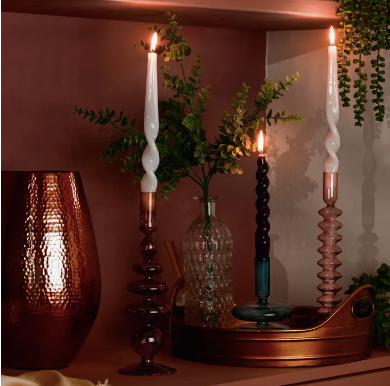 Fun modern candlestick holders with rich colors and retro style. Great as a set for centerpieces or in singles. Note: opening not compatible (small) with our Liz twisted candle sticks.