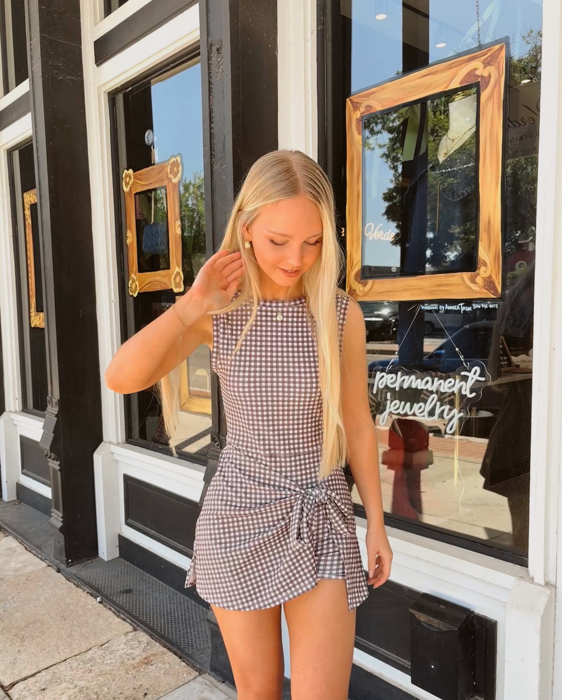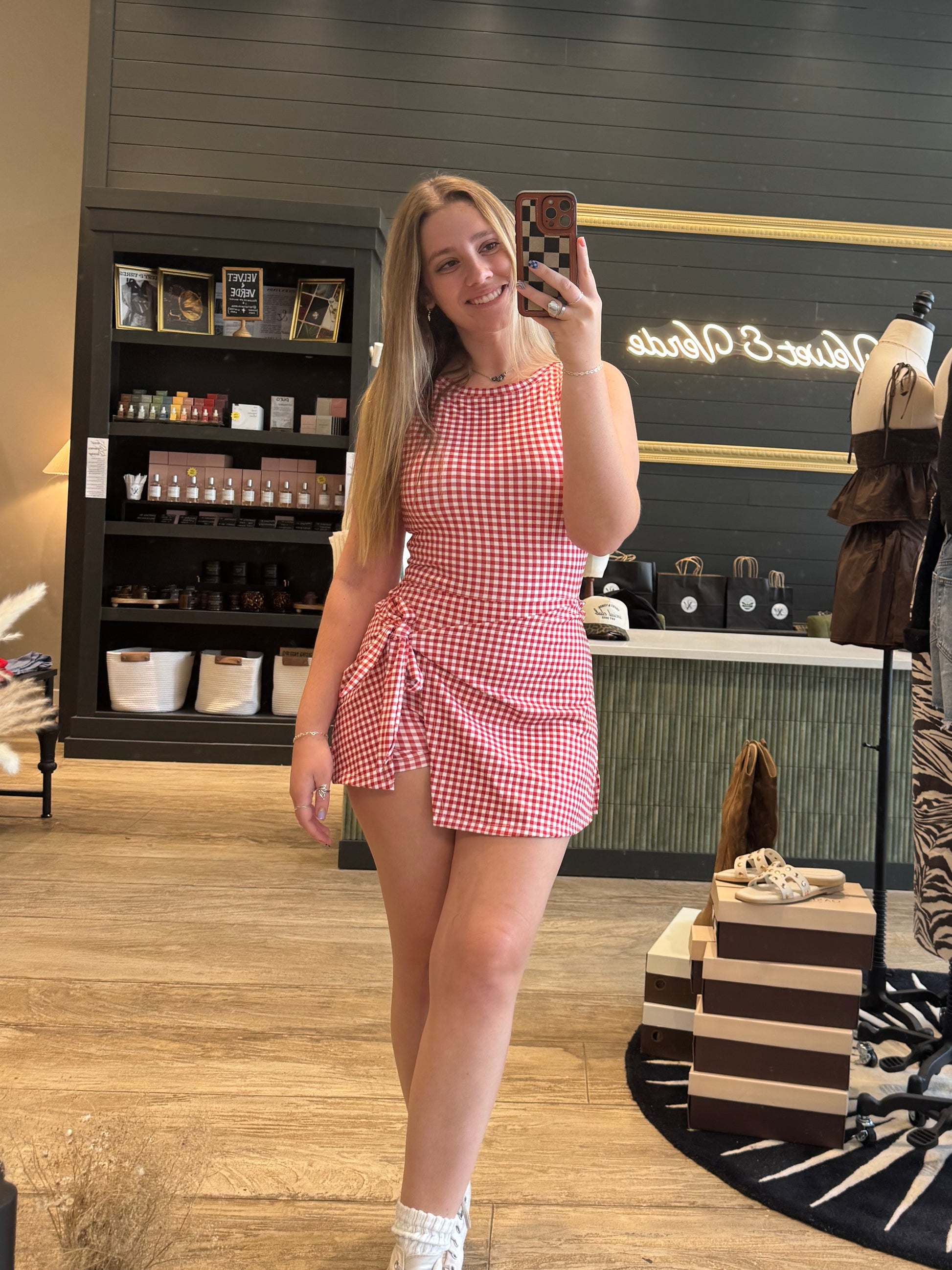 The Marlee Gingham Dress is the perfect blend of style and function. This sleeveless dress features a playful gingham print and a wrap tie front for a touch of whimsy. But don't be fooled - the built-in shorts and moisture-wicking material make this dress comfortable and practical for any occasion.
