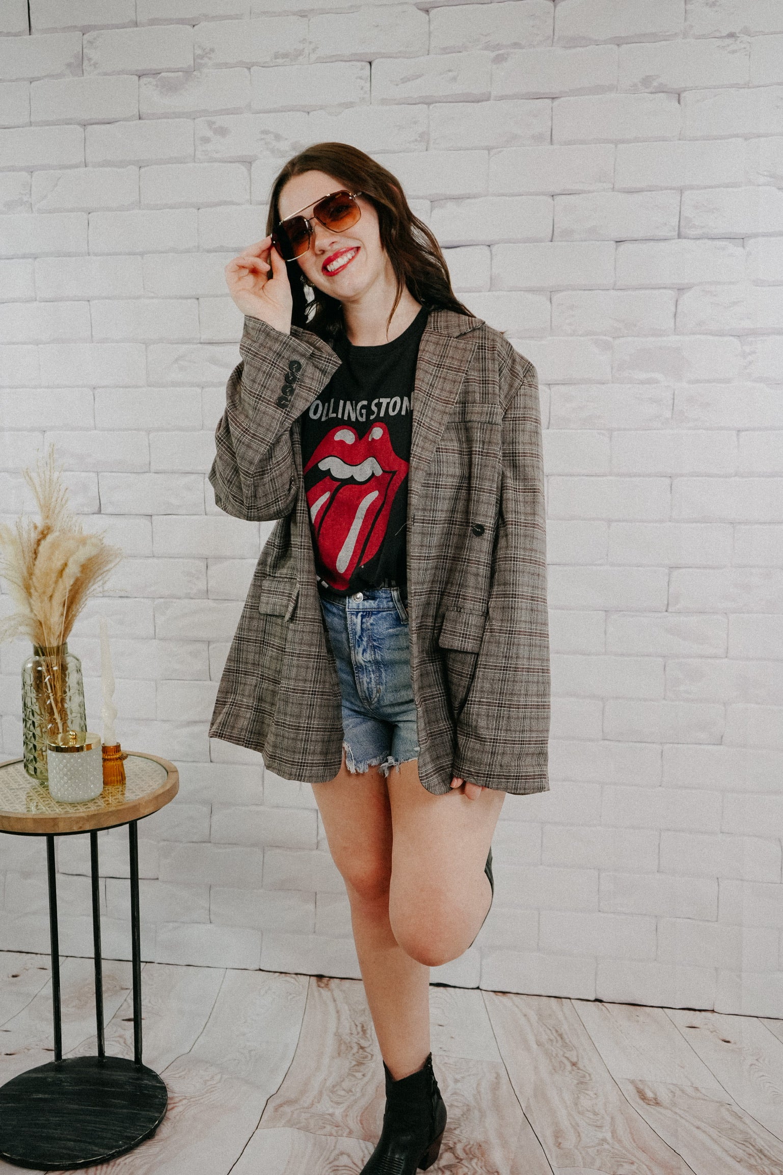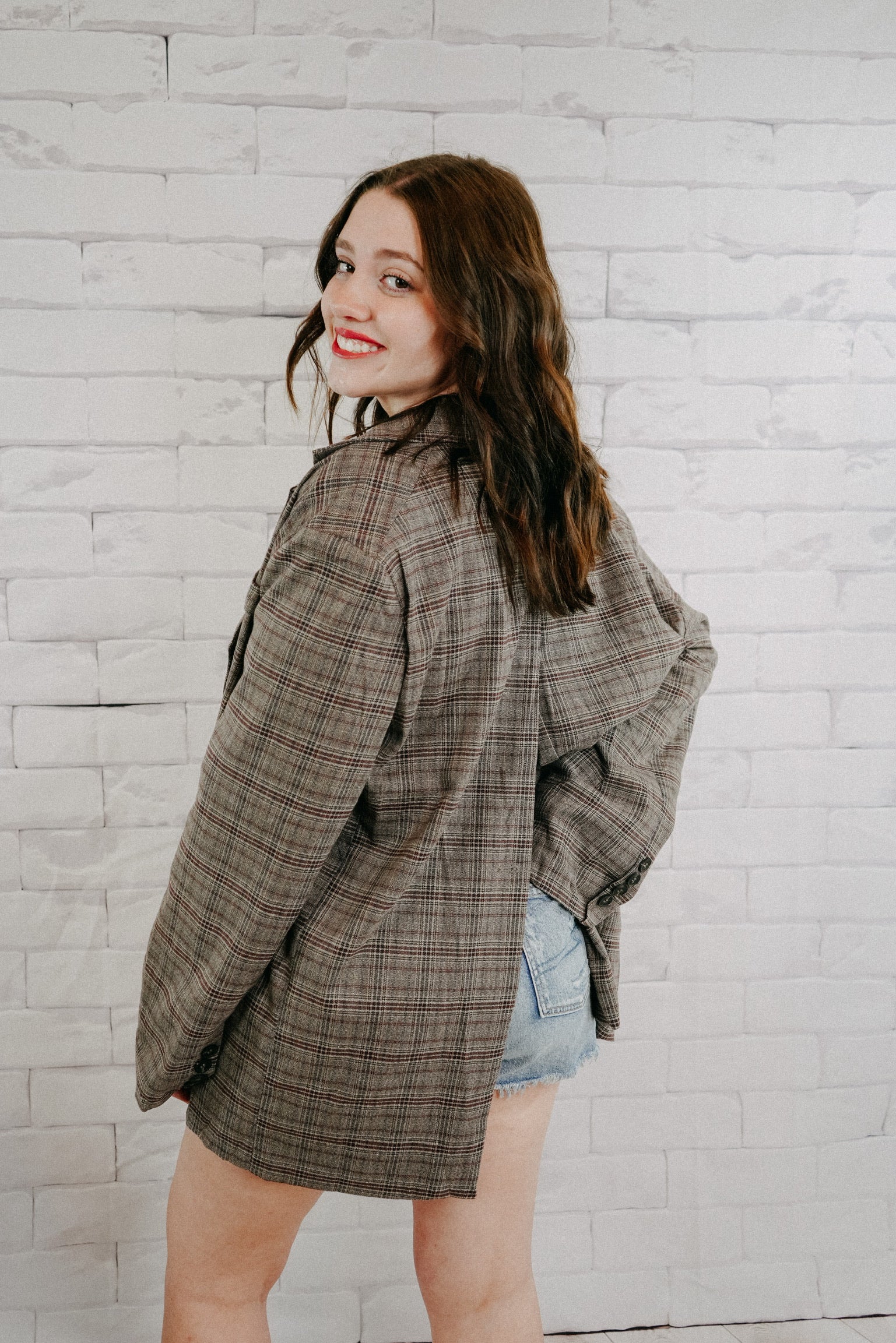 Stay on trend with this stunning oversized blazer! With hints of blue, it looks the cutest with jeans. Also features a cute back detail!