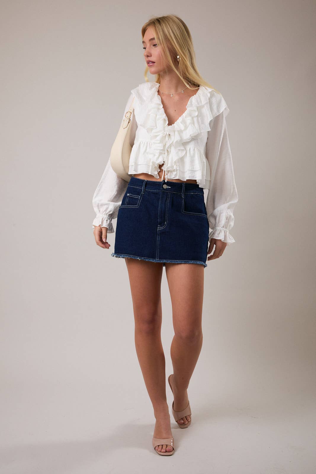 Elevate your everyday style with the Vienna Ruffle Blouse, where feminine charm meets modern edge. This long-sleeve crop features delicate ruffles that add movement and personality to any outfit, from casual brunches to night-out looks. The cropped silhouette pairs perfectly with high-waisted bottoms for a flattering, on-trend vibe. Soft, breathable fabric keeps you comfortable all day long, while the playful ruffle details ensure you'll turn heads wherever you go.