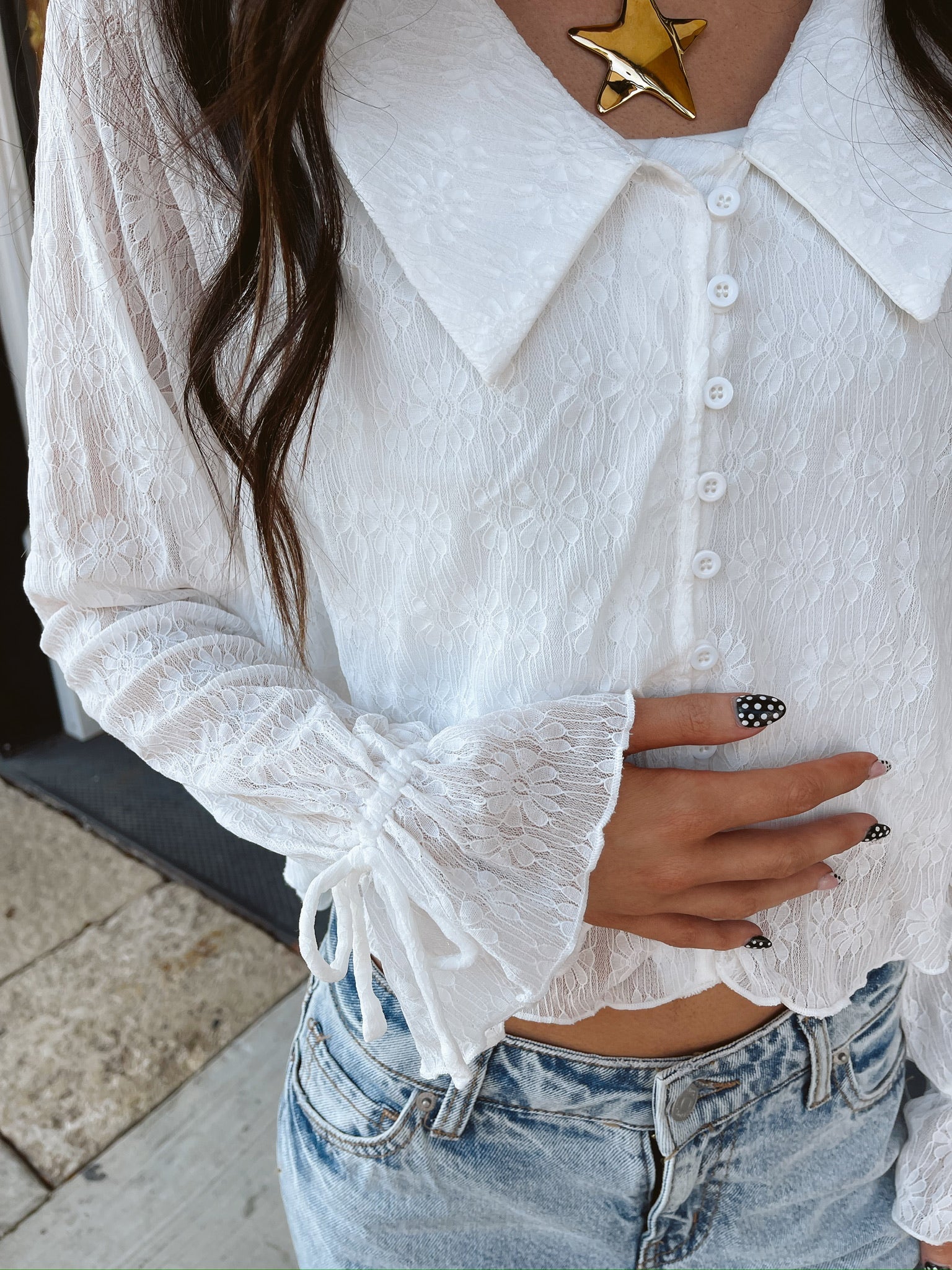 Add a touch of whimsy to your wardrobe with the Lucy Collar Lace Top. Featuring a charming big collar and playful ruffled sleeves, this delicate lace top is perfect for elevating any outfit with feminine flair and effortless style.