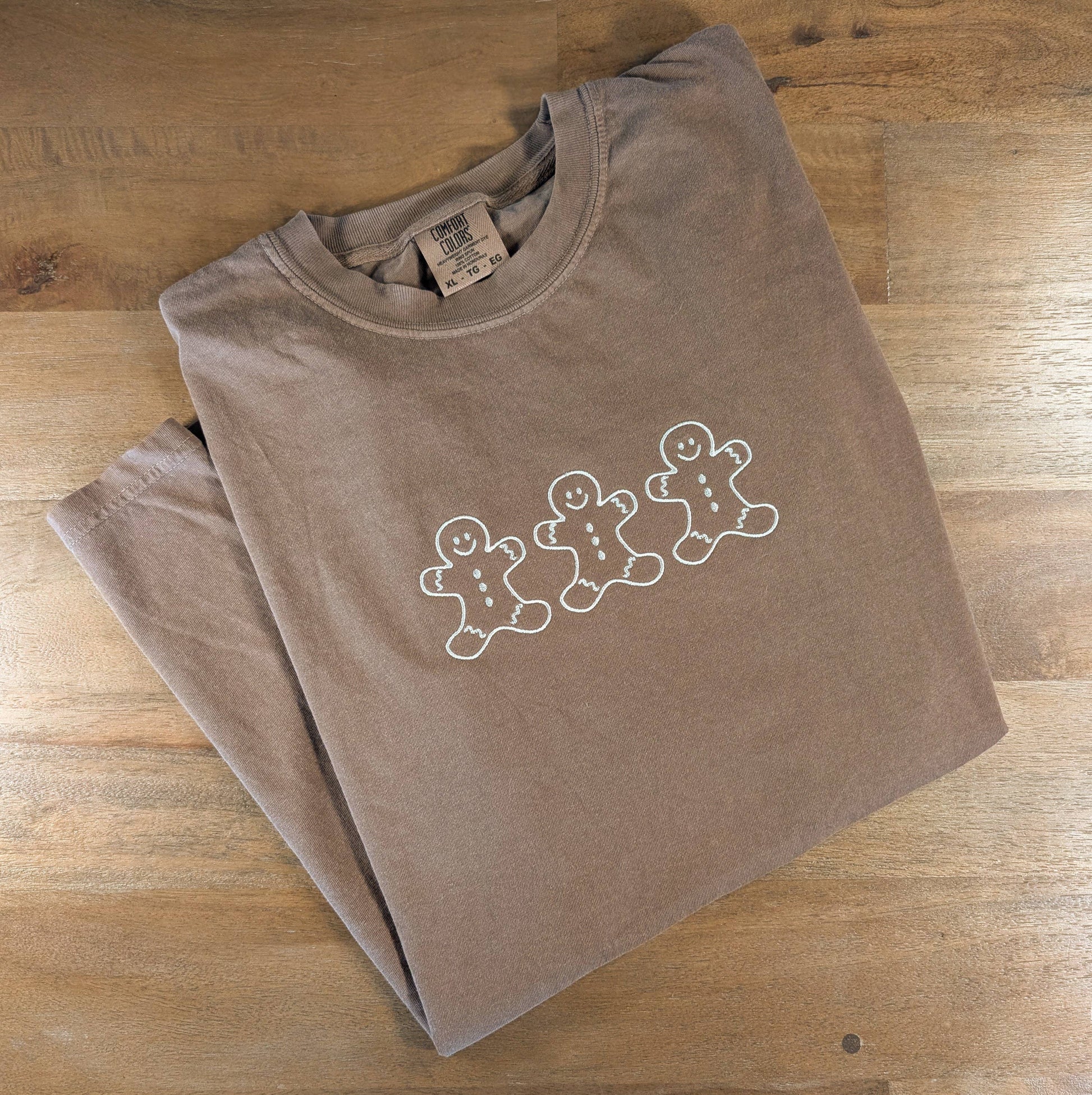 Christmas cookies are the best part of the holiday season, especially a nice sweet gingerbread cookie! This tee is machine embroidered with the outline of three gingerbread men, all stitched in white thread.