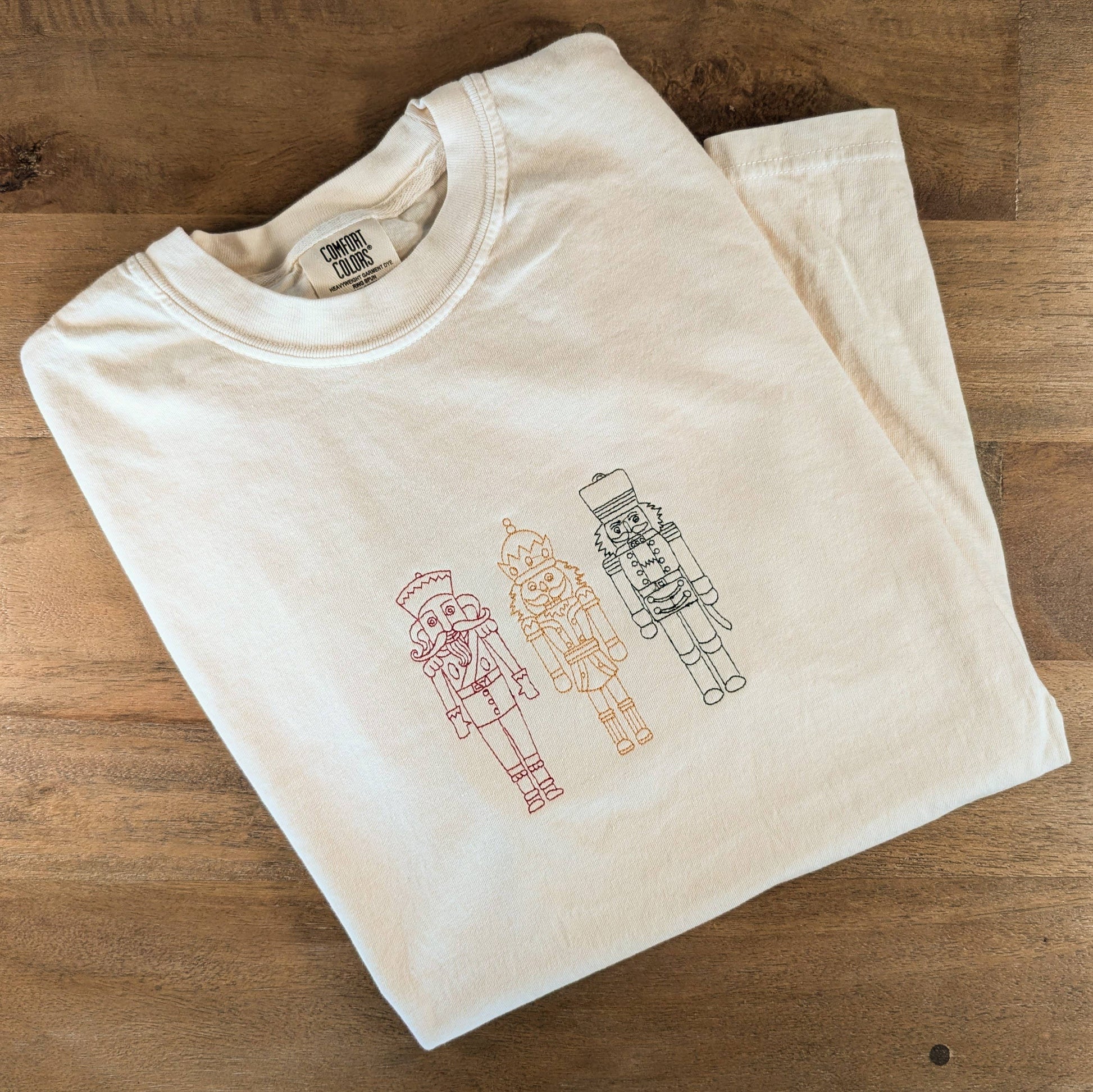 A classic Christmas icon, these three nutcrackers make the cutest Christmas tee! This Comfort Colors tshirt is machine embroidered with minimalist nutcracker outlines in three different colors.
