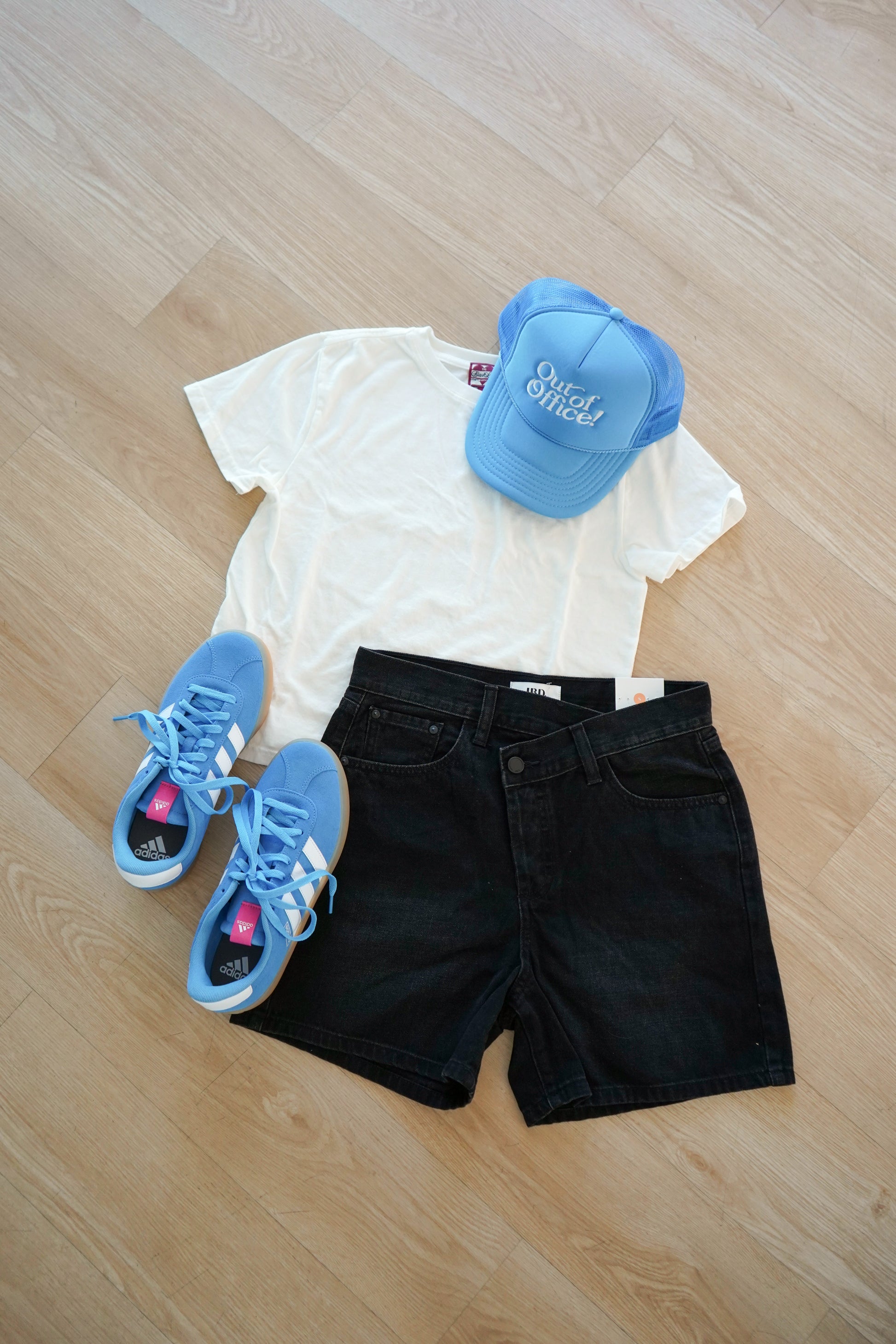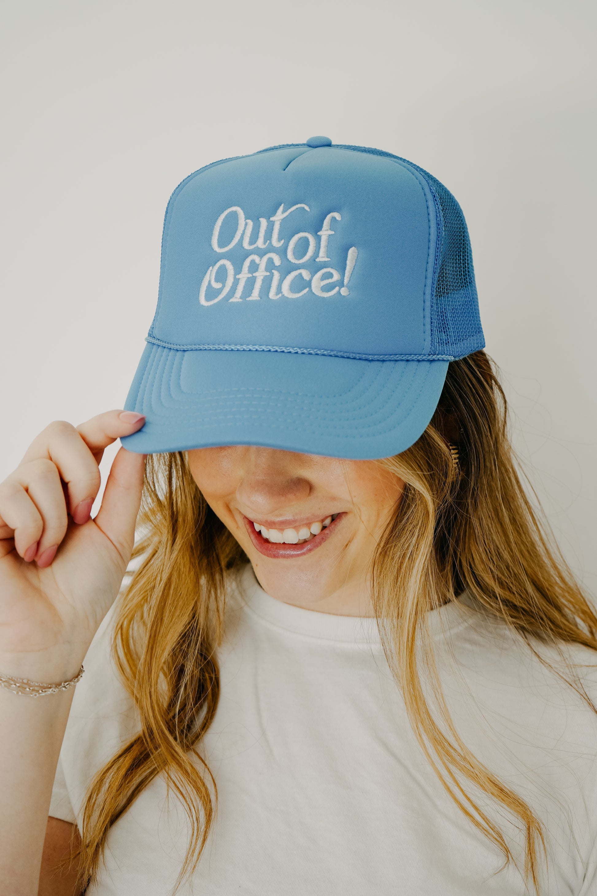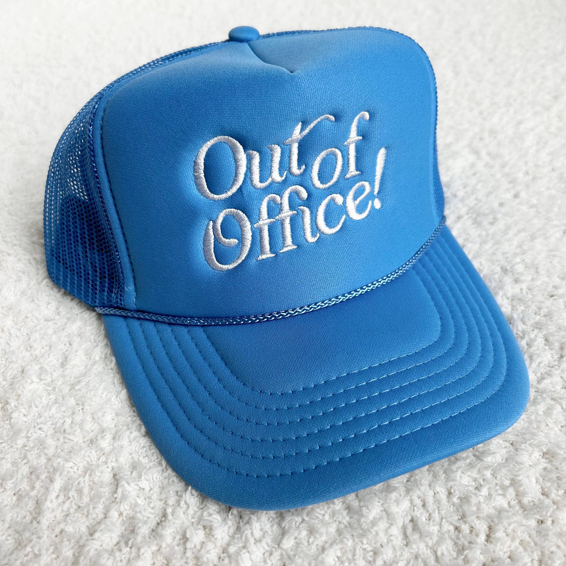 Get ready to embrace your vacation mode with our Out Of Office! Trucker Hat in blue. Made with 100% polyester and a breathable mesh back, this hat features a playful embroidered design and adjustable snap closure.