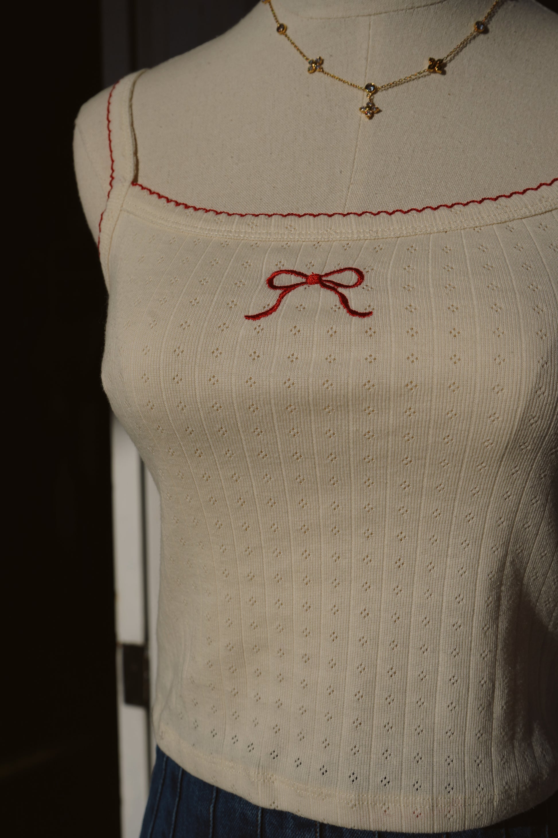 Delicate embroidered bows add a touch of whimsy to this lightweight pointelle knit cami—perfect for layering or wearing solo. The soft, breathable fabric moves with you, while the fitted silhouette flatters without clinging. Dress it up with a blazer or keep it casual with your favorite jeans. A versatile staple that brings personality to any outfit.