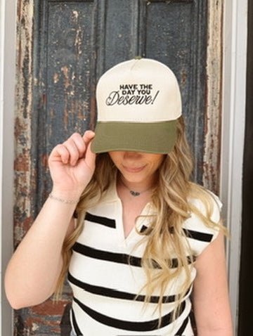 Make a statement with our Have the Day You Deserve Hat, available exclusively at Ruby Moon! This natural and olive green 5-panel cap features a bold black embroidered slogan that inspires positivity.