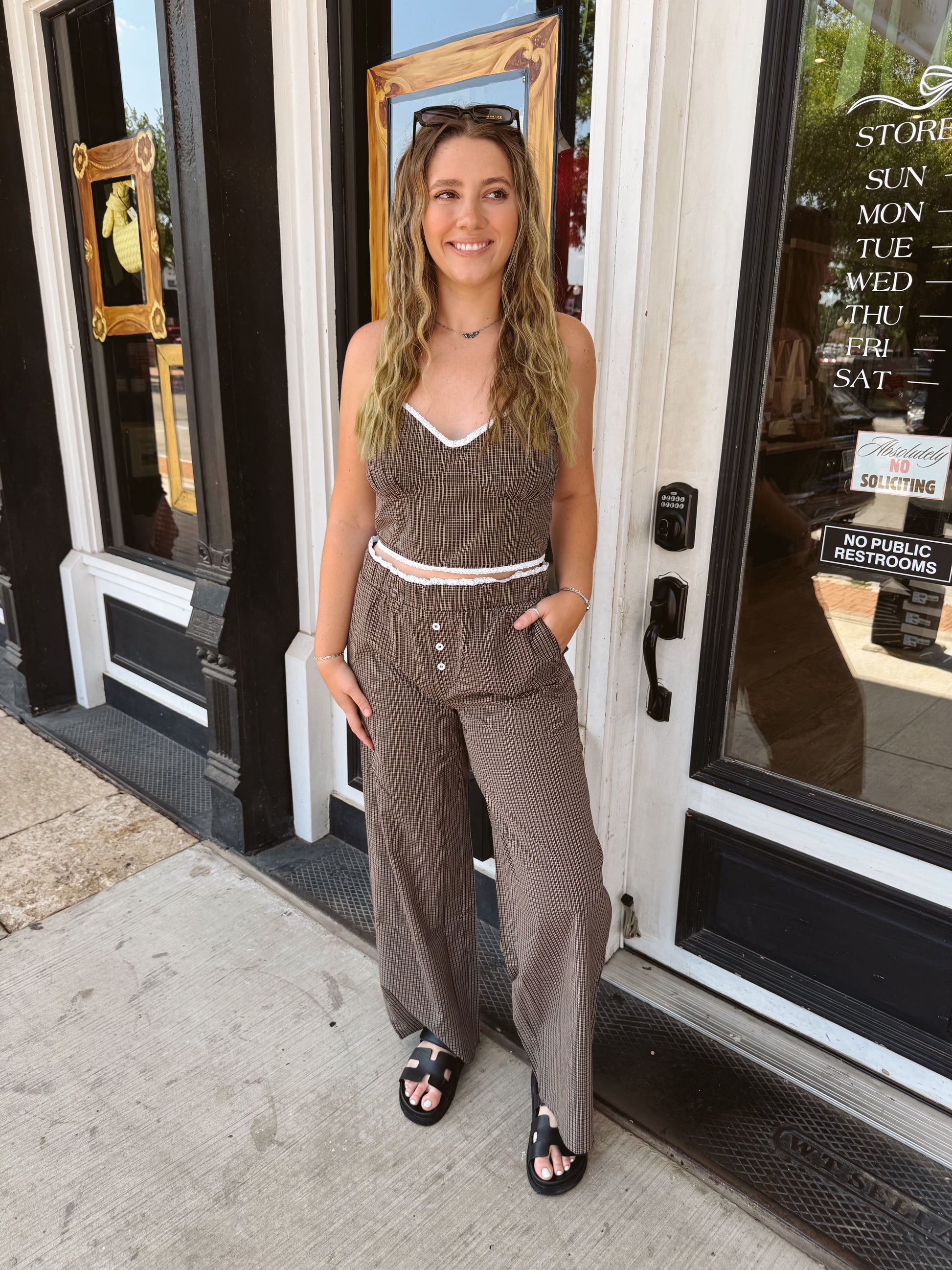 This Espresso Gingham Set pairs a flirty cami top with comfy boxer pants, both edged with delicate lace trim for a touch of charm. Perfect for lounging or catching some zzz’s, it blends cozy comfort with playful style in a classic gingham print. Slip into this set and feel effortlessly cute all day or night!