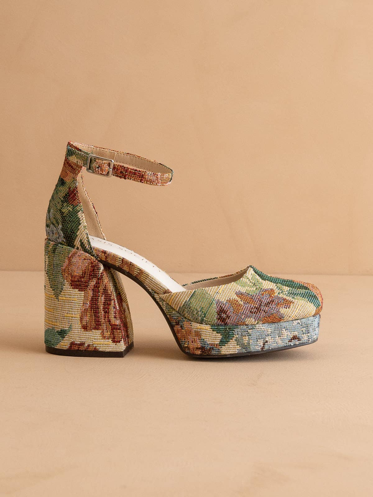 Fun, chunky, platform Mary Janes. Due to the unique patterning of the materials each shoe will have a unique pattern that may not match the other foot.