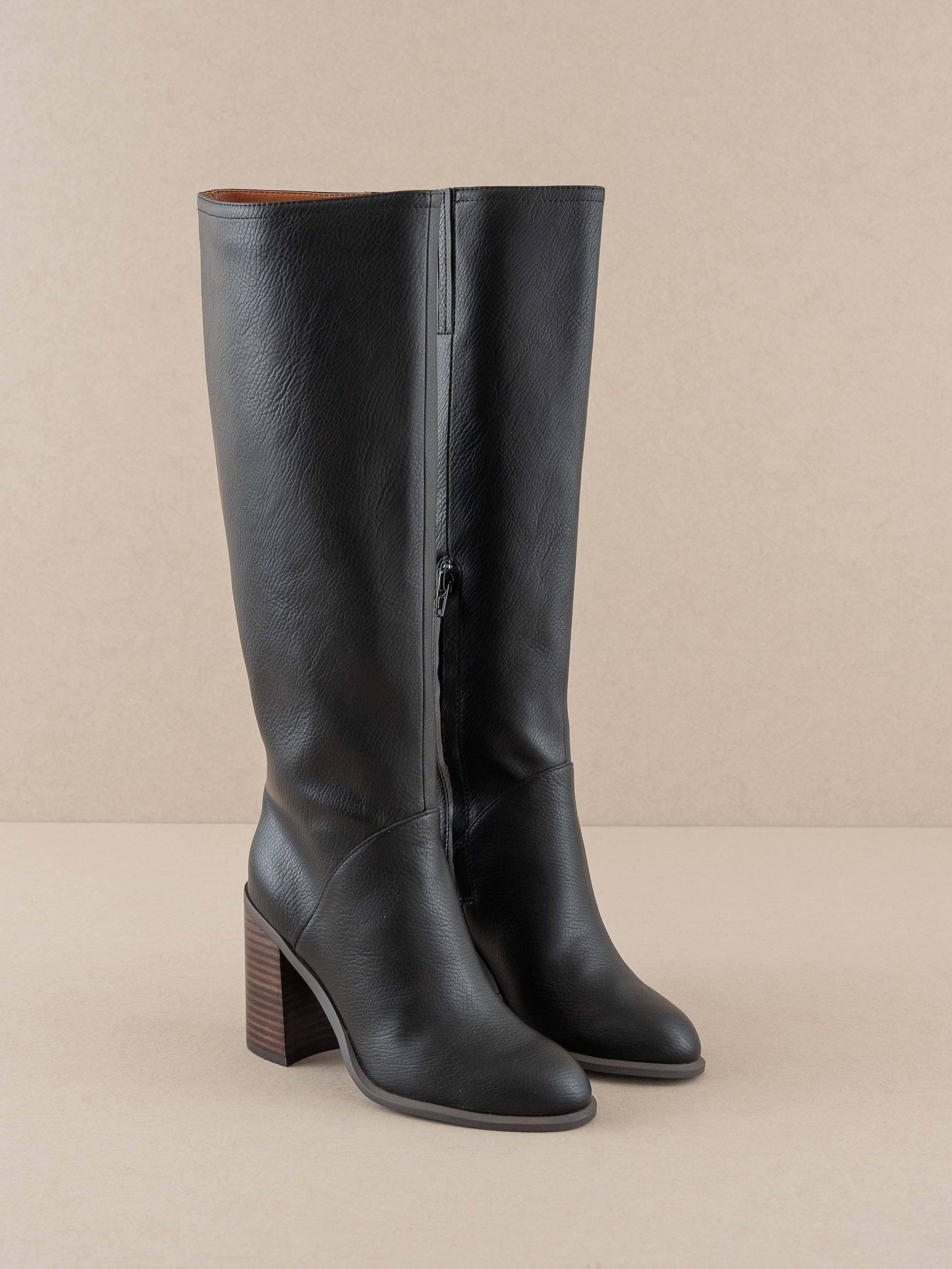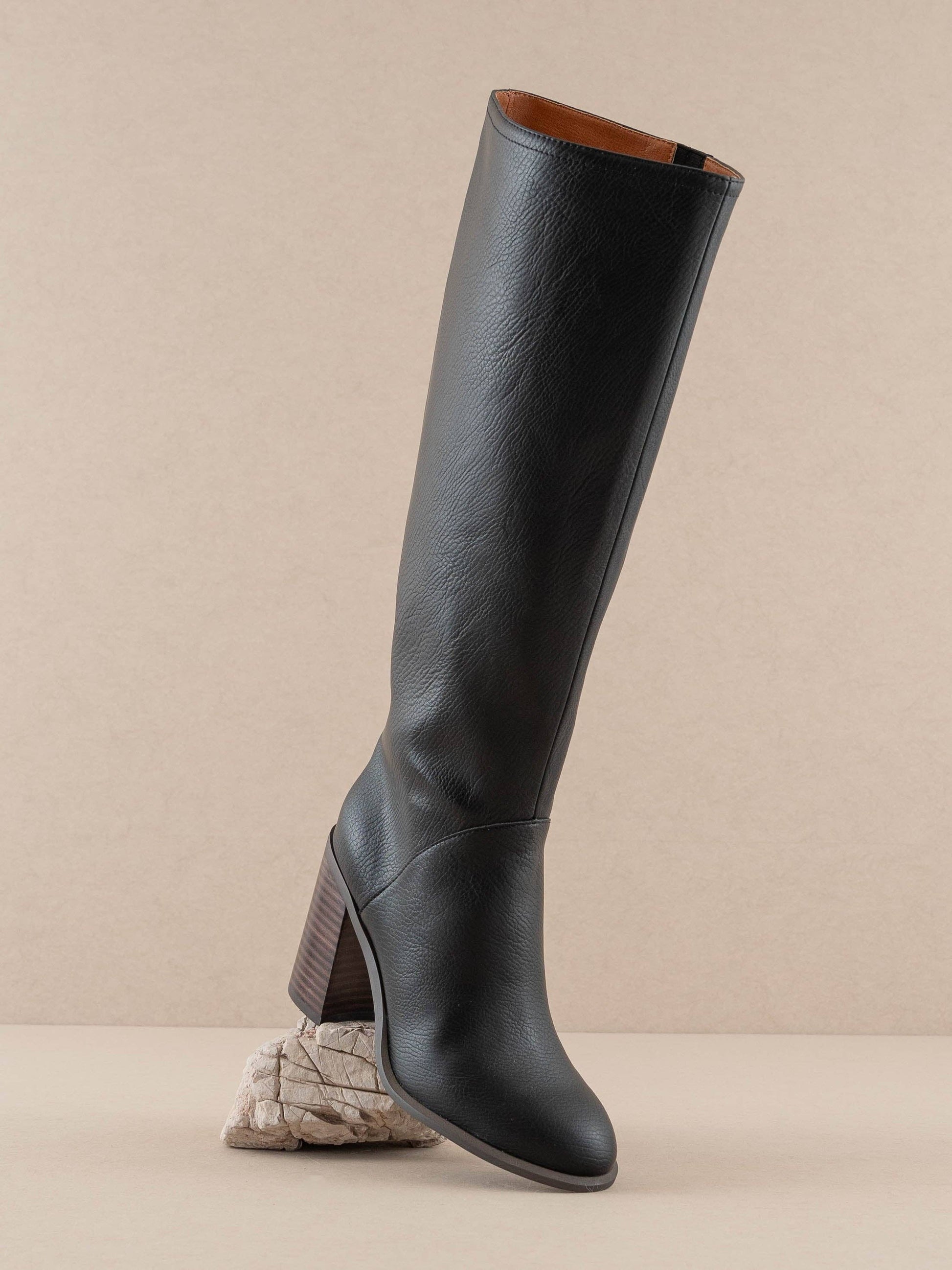 A beautiful tall vegan leather boot on a stacked heel makes it a versatile staple in any wardrobe!