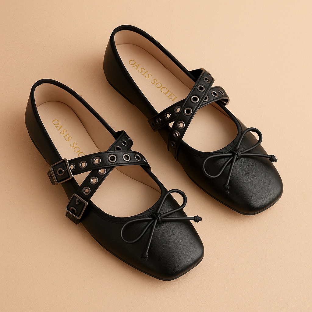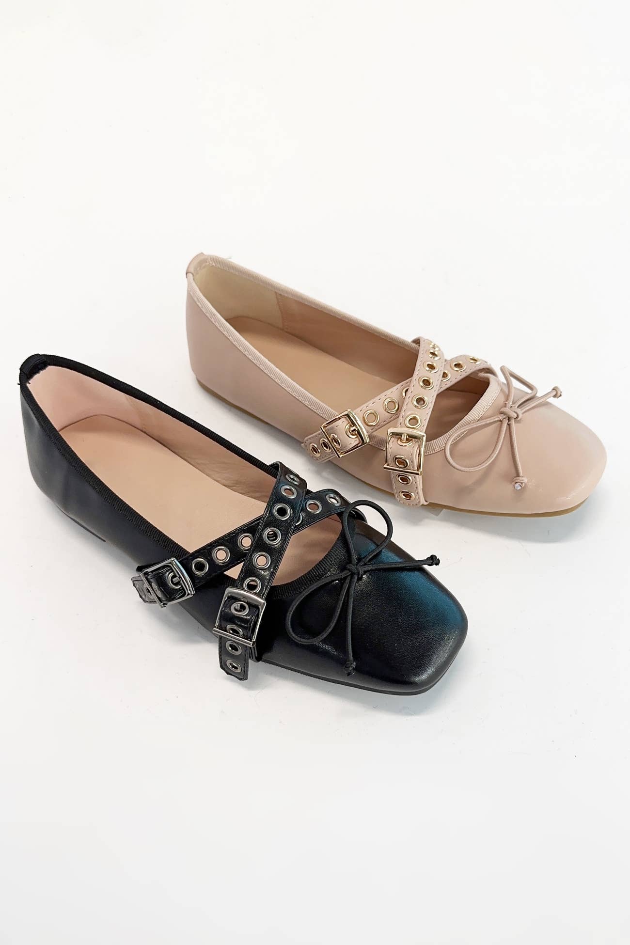The Kendall Grommet Ballet Flats offer a unique twist on traditional ballet style flats with a cross over strap and buckle fastening, making them easy to slip on and off. The matte upper fabric and lightly cushioned insole provide comfort, while the slim bow detail and square toe front add a touch of elegance.