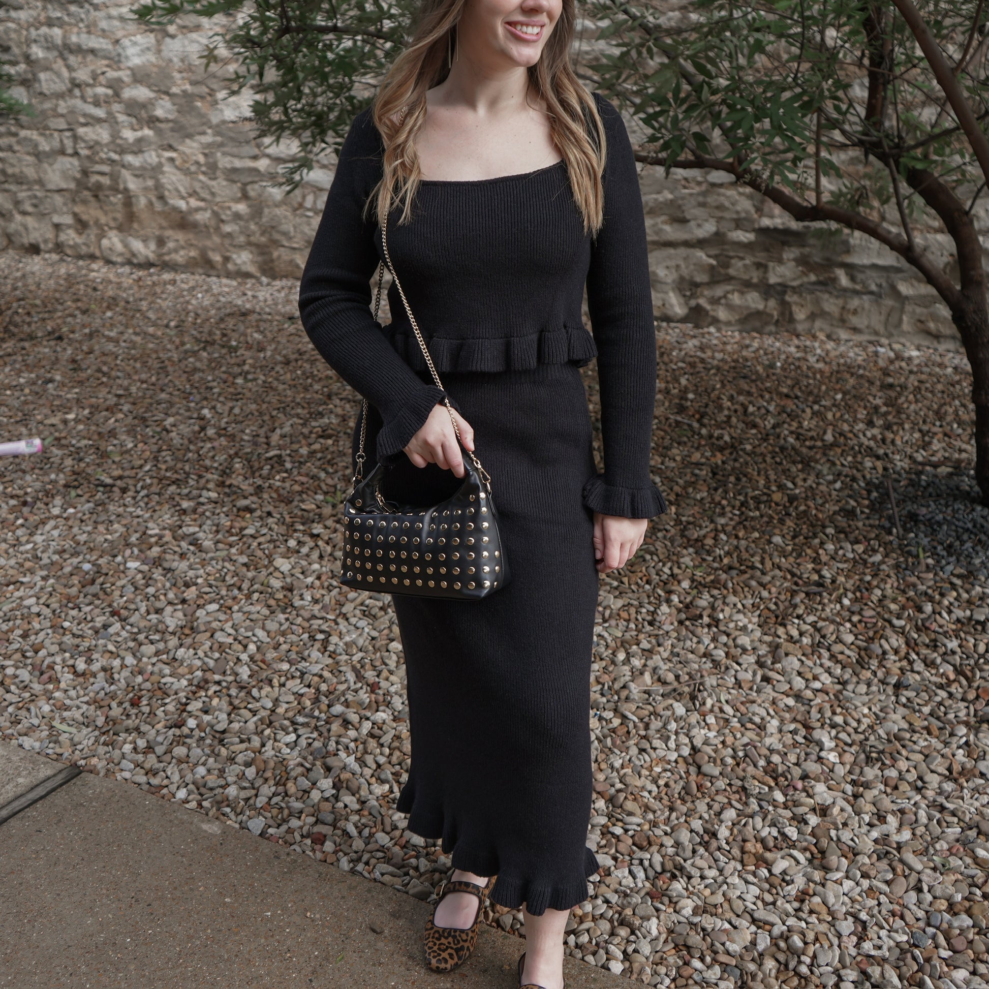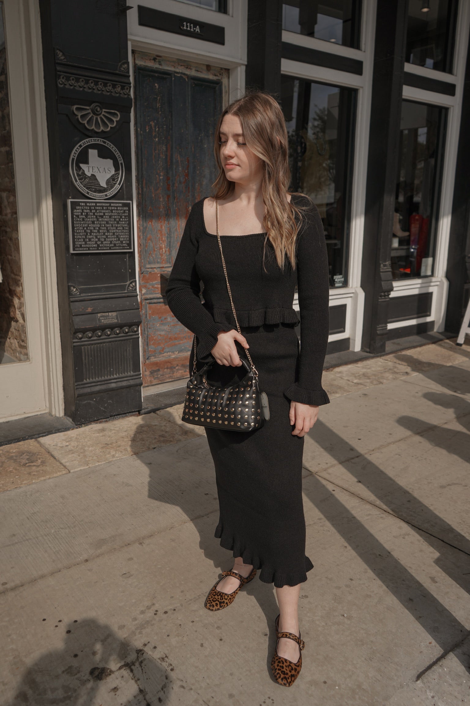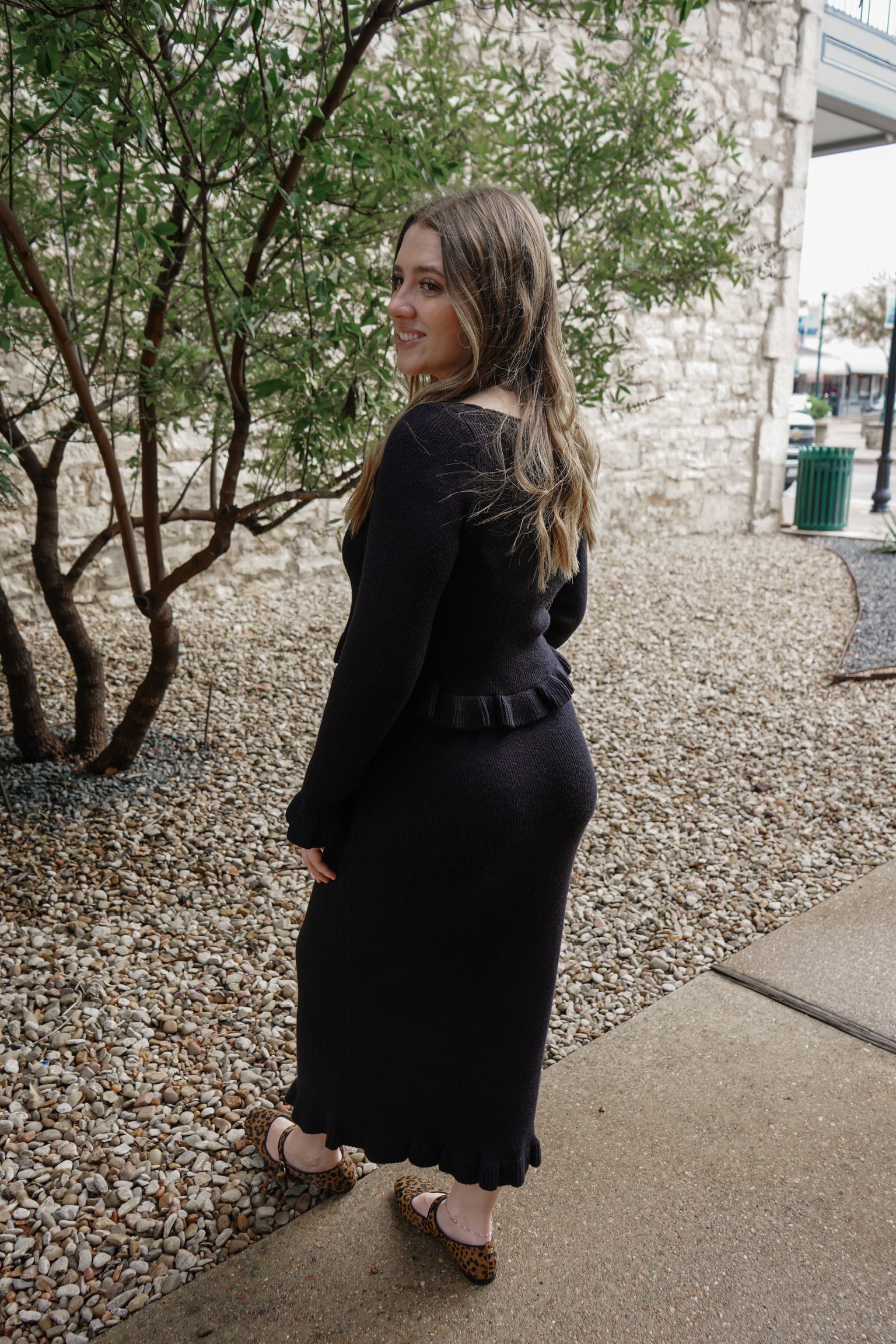 Introducing the Willa Sweater Set: a playful combo of a ruffle hem sweater top and midi skirt. The square neck adds a touch of chic while the ruffle hem and midi length add a flirty twist. Perfect for a fun day out (or in)!